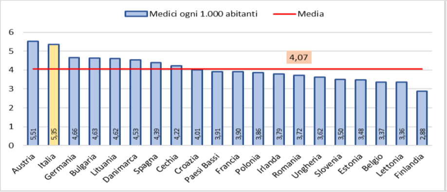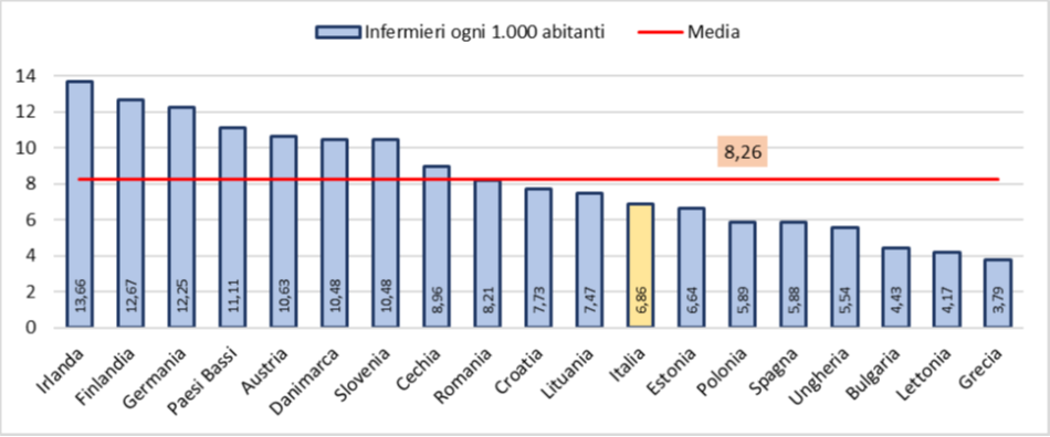Dal confronto con le medie EU emerge che attualmente il personale sanitario italiano rapportato alla popolazione è caratterizzato da un numero complessivo di medici superiore alla media europea e da un numero di infermieri insufficiente. Se sul fronte medico la questione è l’età avanzata, sugli infermieri il problema resta la carenza strutturale. Nel 2023 erano 277.138, circa 8.800 in più rispetto al 2019. Ma il tasso di copertura è ancora insufficiente: 6,86 per mille abitanti contro una media europea di 8,26. Il rapporto infermieri/medici è di 1,3 contro 2,1 della media OCSE, segnalando uno squilibrio che penalizza il sistema.