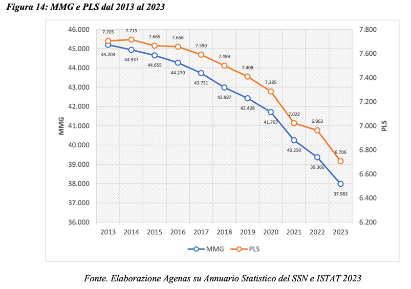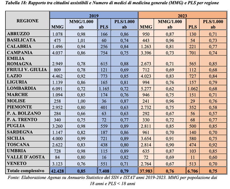 Il Servizio sanitario nazionale rischia di trovarsi a breve senza un’adeguata rete di assistenza primaria e abbiamo visto come già questo sia un problema con numerosi accessi impropri ai Pronto Soccorso. I dati Agenas sul personale del SSN evidenziano un calo costante di medici di medicina generale e pediatri di libera scelta: dai 45.203 MMG del 2013 si è scesi a 37.983 nel 2023, mentre i pediatri sono passati da 7.705 a 6.706 nello stesso periodo. Una contrazione che pesa sulla capacità del sistema di garantire prossimità e continuità delle cure, proprio mentre aumenta l’età media dei professionisti e si avvicina l’ondata dei pensionamenti. Il confronto europeo è eloquente: l’Italia conta 68,1 MMG ogni 100mila abitanti, contro i 72,8 della Germania e i 96,6 della Francia. In parallelo cresce il numero di assistibili per ciascun medico: nel Lazio si passa da 0,92 MMG per mille abitanti del 2019 a 0,83 nel 2023; in Lombardia da 0,72 a 0,62; in Campania addirittura da 0,86 a 0,73. Anche per i pediatri la riduzione è diffusa, con un peggioramento del rapporto bambini/pediatra in quasi tutte le regioni.
