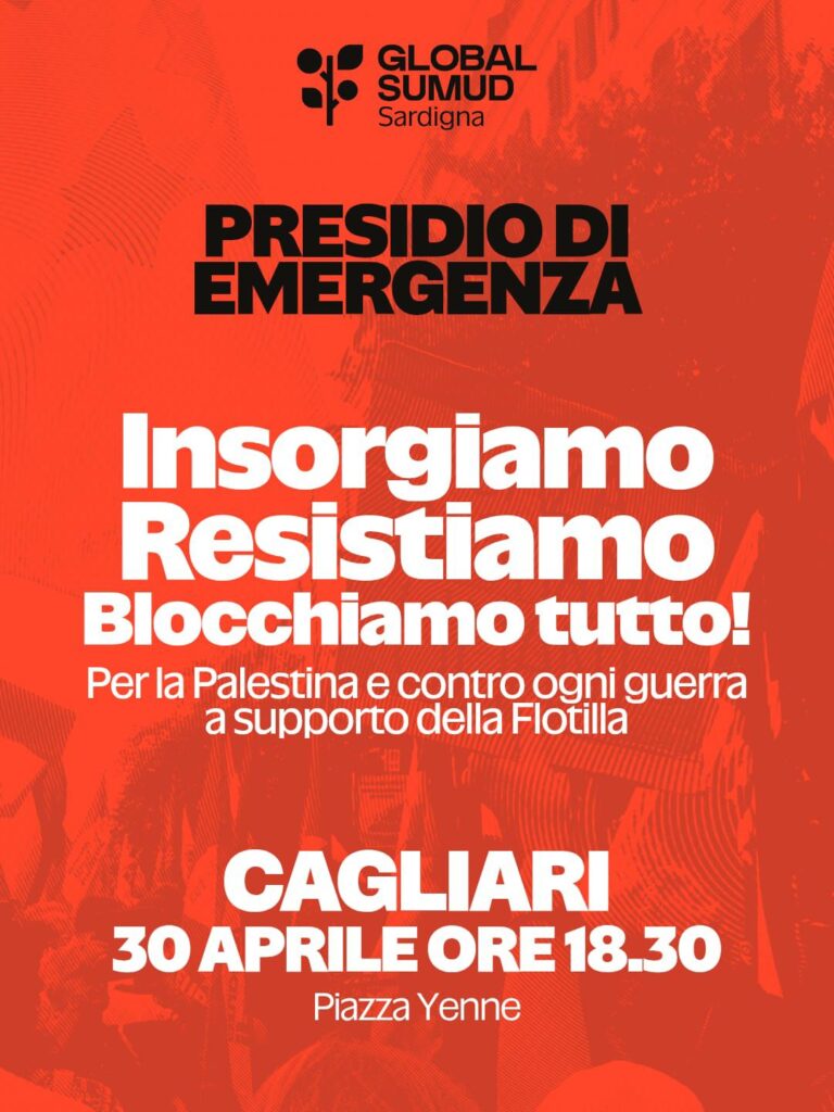 Stanotte la Flotilla stava navigando a migliaia di km da Gaza ed è stata bloccata da Israele nell’ennesimo atto di pirateria in acque internazionali. L’Idf ha abbordato le imbarcazioni, ha costretto attiviste e attivisti a mettersi in ginocchio con le armi puntate, ha arrestato circa 400 persone e distrutto decine di imbarcazioni. Un atto totalmente illegale. Abbiamo perso le tracce di 55 cittadine e cittadini italiani che erano a bordo. Per questo motivo ci incontriamo questa sera alle 18.30 a Cagliari in Piazza Yenne.