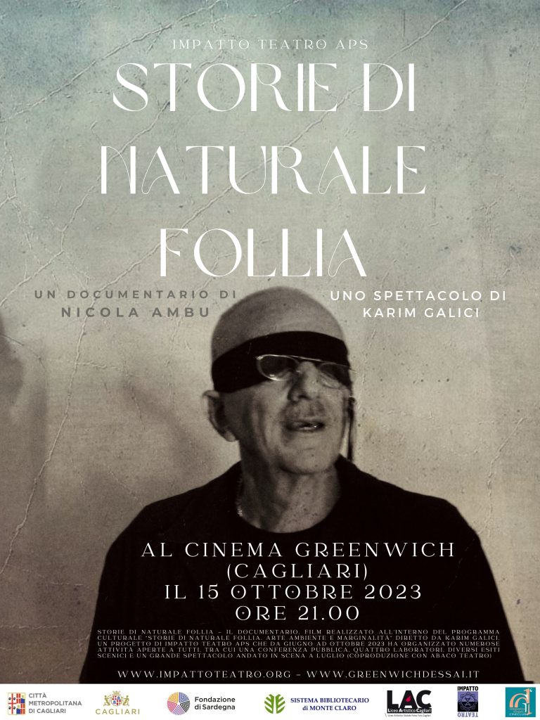 Domenica 15 ottobre 2023 alle ore 21.00 al Cinema Greenwich d’Essai di Cagliari, in occasione della proiezione in prima assoluta del documentario “Storie di Naturale Follia” prodotto da Impatto Teatro per la regia di Nicola Ambu, il foyer e la sala del cinema si trasformeranno in un immersivo spaccato del più ampio progetto “Storie di Naturale Follia. Arte, Ambiente e Marginalità” diretto da Karim Galici.