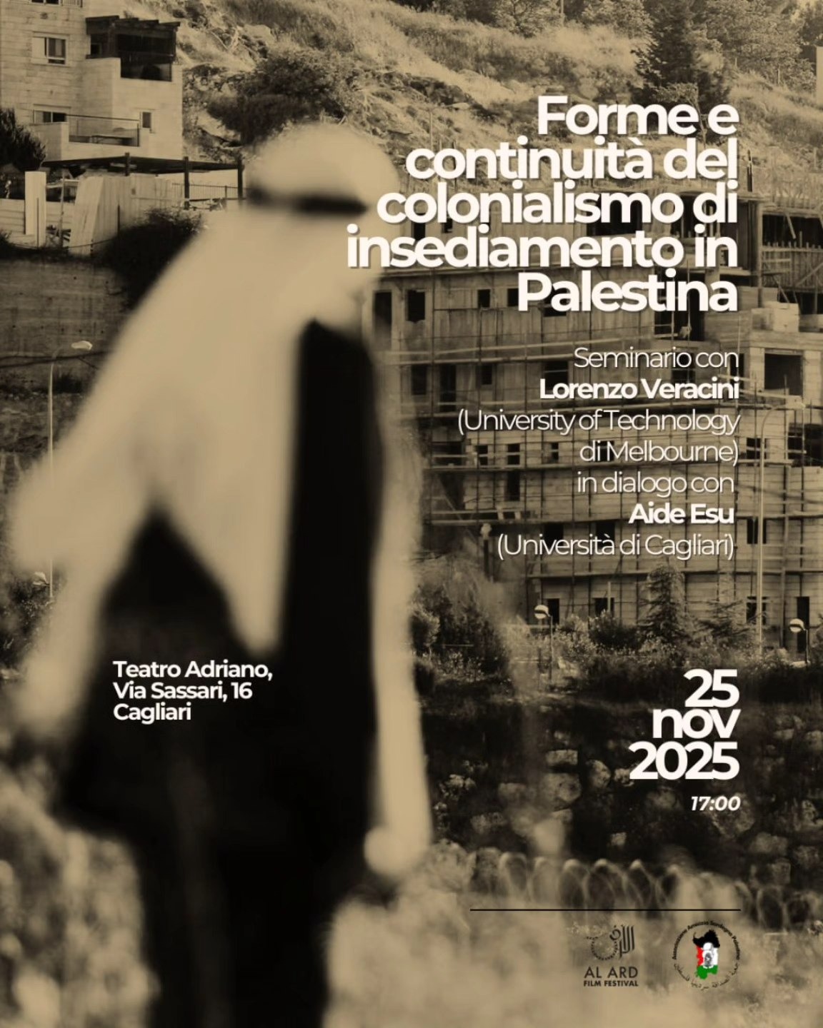 Il 25 novembre 2025, alle ore 17:00, il Teatro Adriano di Cagliari ospiterà il seminario “Forme e continuità del colonialismo di insediamento in Palestina”, un appuntamento di approfondimento e dialogo sul tema del colonialismo di insediamento e sulle sue manifestazioni nei territori palestinesi.